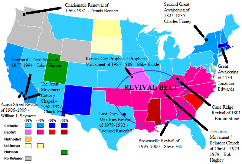A revival map of Evangelical and Charismatic revivals (except for the 50s Healing Revival, which I consider false):–complete with the current population of dominant religions in each state. (Click to Enlarge).