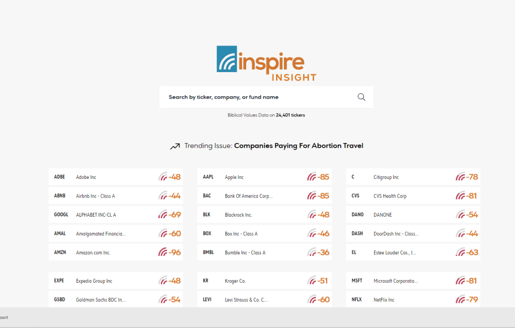 This is a very rare case of Christian business competition, unlike anything I’ve ever run across, in the whole history of Christian economic ethics. Not even the Puritan merchants, competing with each other in London and Boston, have come up to this on a moral level. And I’m sure that they consider themselves all friends, and respect each other professionally and as members of the body of Christ: but in terms of what BRI clients really want: I can tell you what I want: and that is something like inspireinsight.com that will help me make informed decisions about stocks, ETFs, bonds, bond funds, and mutual funds. I would like to see all of the BRI firms make use of the Inspire Impact Score or get out of the BRI business! I’m totally serious about that. I know that might sound impolite, but these are some heavy ethical issues at stake here. And also millions of dollars of misspent Christian money. It should be approached seriously and with a spirit of excellence. I am very sorry to say that these BRI firms have funds that are filled with many stocks that donate to LGBT things, abortion things, hotel pornography, telecom pornography, etc. This has got to break God’s heart! (see 1 Cor. 6:9-11; 2 Chron. 33:6; Matt. 5:28).