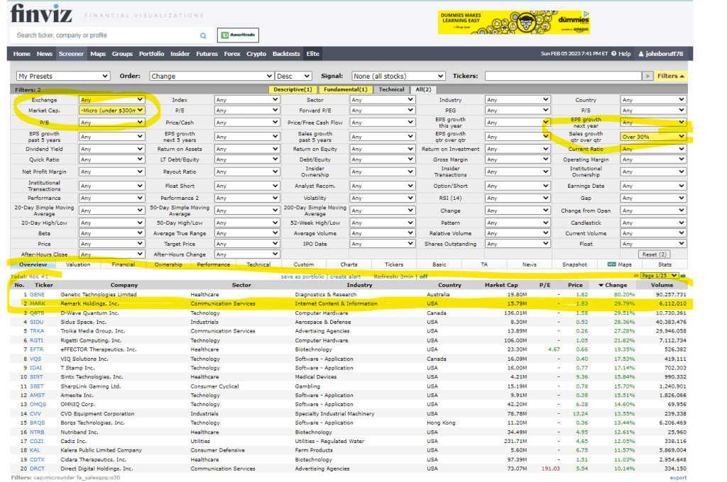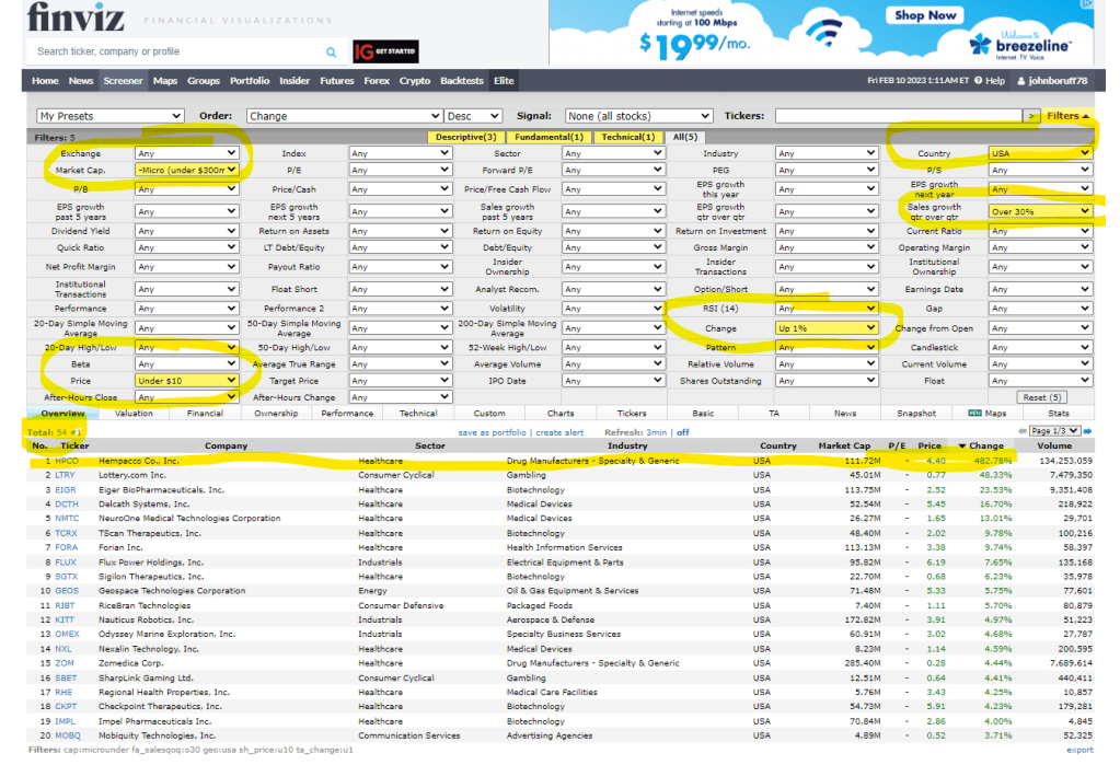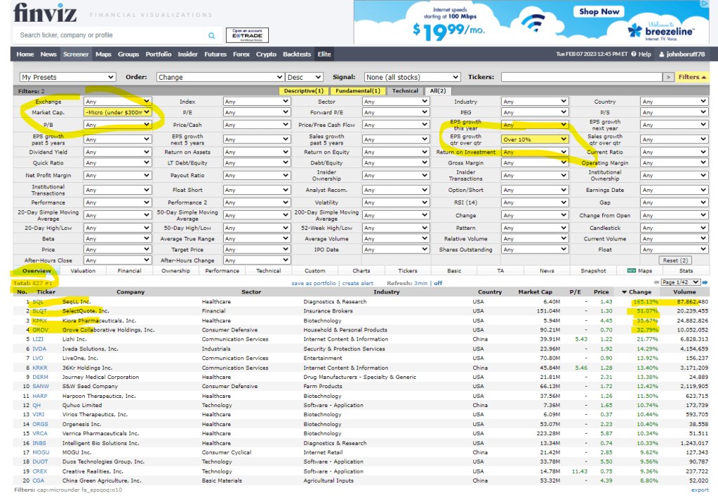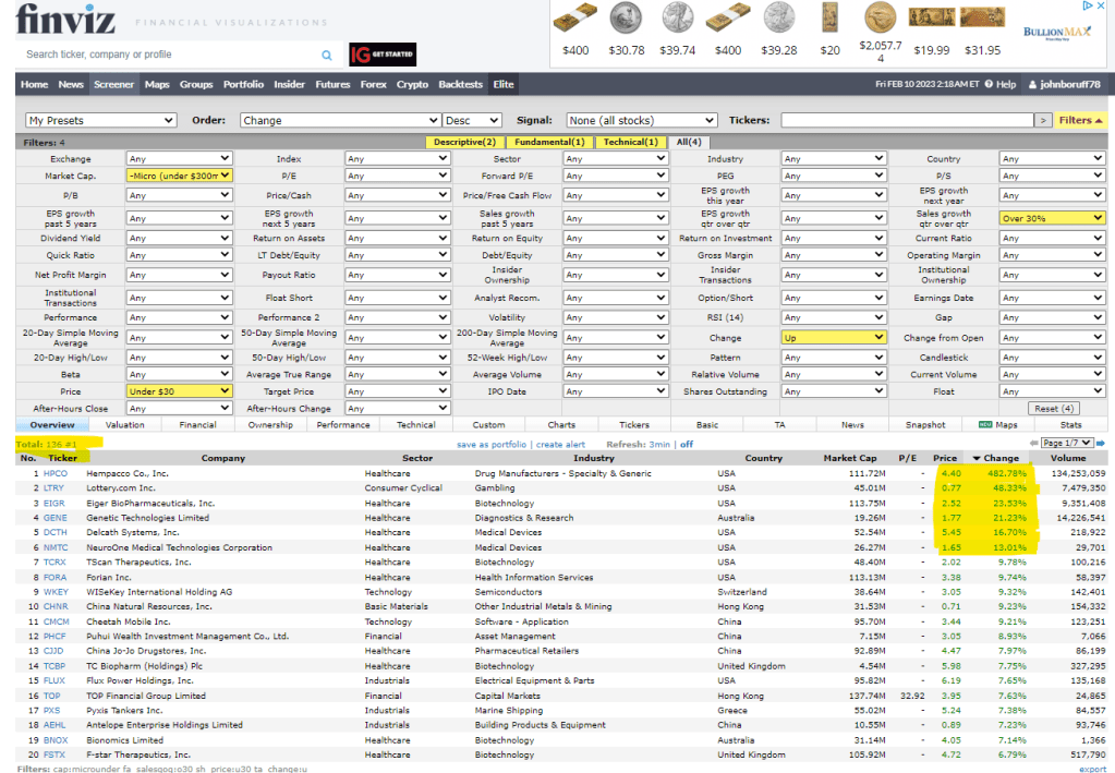 UPDATE: 2/10/23 – I’d have to believe that if you bought just one share for all of these microcap stocks, just for monitoring purposes, then you would increase your odds of winning what Peter Lynch calls a few “pleasant surprises” with “tenbaggers” (One Up on Wall Street, pp. 242-243). This screen assumes all of the stocks are: 1. Under $300m Market Cap (Microcaps). 2. The stock price is under $10 which gives it plenty of room to grow by an upward price movement. 3. The price change is up at least 1% green every day. 4. The stocks are all in the USA (higher SEC standards and no communism). 5. Quarterly sales growth is above 30%. These are five criteria for, I would have to imagine after having read 90% of Lynch, a list of very strong short-term stocks that could become potential tenbaggers. As you can see a fourbagger populated at the top of this screen–OUT OF A TOTAL OF ONLY 54 STOCKS TO CHOOSE FROM. Except for the gambling, abortion drug, LGBT, and porno companies, even if I owned one share of 90% of the stocks on this list–my odds of landing a three, four, five, six or sevenbagger, or higher are pretty good I’d think.