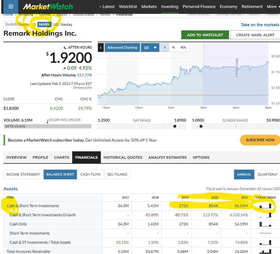 Remark Holdings (MARK) would definitely be the type of growth stock that Peter Lynch would buy, because in the past three years or so, it has been INCREASING ITS “CASH” ASSETS and DECREASING ITS LONG-TERM DEBT. You can find this on the “Financial Statements: Balance Sheet” of a stock on Value Line and the “Financials: Balance Sheet” of a stock on MarketWatch.