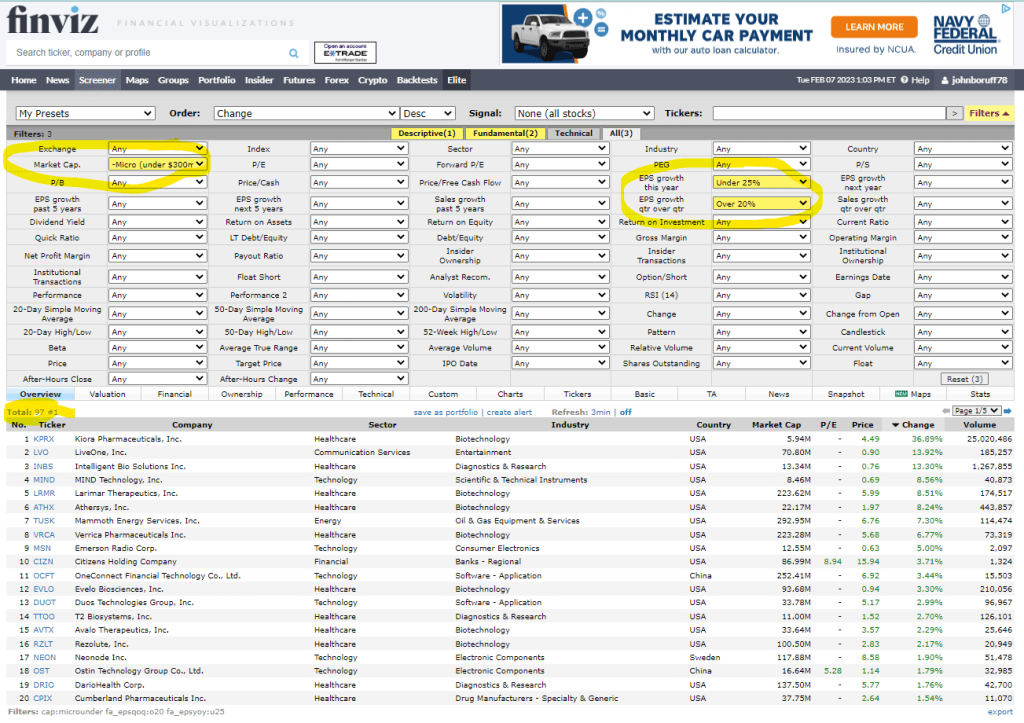 UPDATE: 2/7/23 – I think this would be a very Lynch type stock screen when applied to short-term trading in microcap stocks. After reading chs. 14-15 in One Up on Wall Street about the fast growers, I came to this conclusion for screening stocks on Finviz.com: