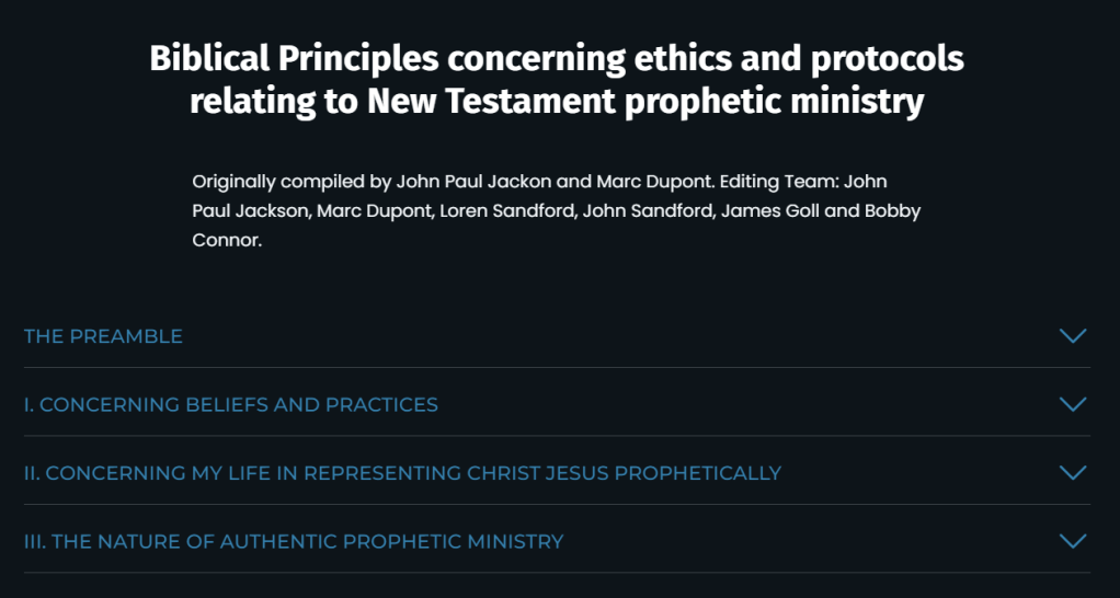 John Paul Jackson, R. Loren Sandford, John Sandford, James Goll, etc. “Biblical Principles Concerning Ethics and Protocols Relating to New Testament Prophetic Ministry.” also here.