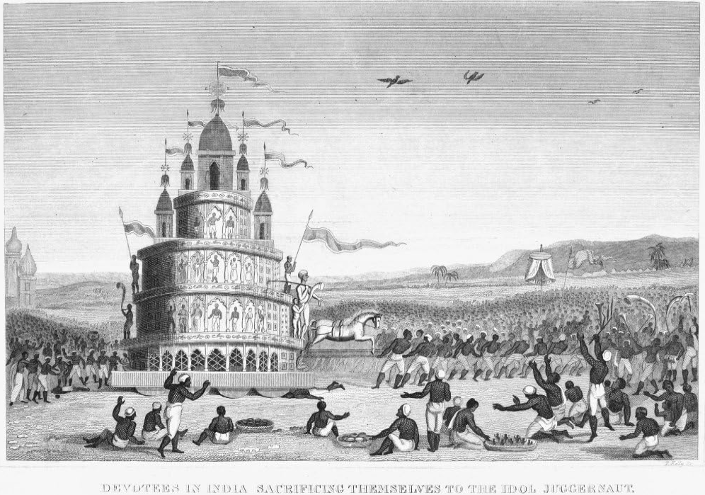 The Car of Juggernaut was a vehicle of human sacrifice in India. People used to commit suicide by throwing their bodies under the stone wheels and being crushed to death, with their blood splattering all over the wheels, in sacrifice to the gods.