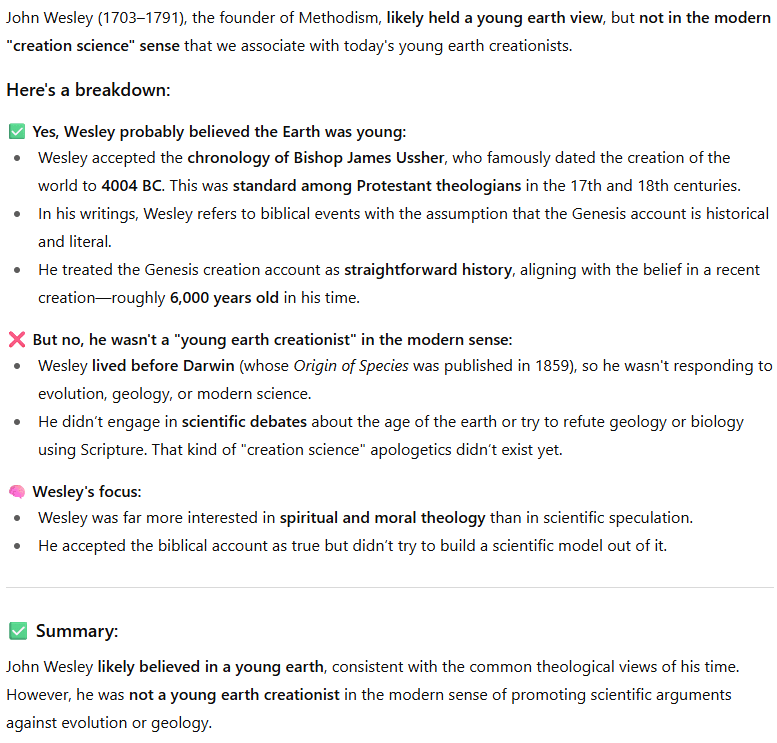 WESLEYAN THEOLOGIANS THAT AFFIRMED YOUNG EARTH CREATION OR BISHOP USSHER’S TIMELINE FROM ANNALS OF THE WORLD. THESE TEACHERS CAN BE TAKEN MORE SERIOUSLY AS INTERPRETERS OF GOD’S WORD, BECAUSE THEY ELEVATED THE DOGMA OF BIBLICAL REVELATION ABOVE MODERNIST IDEAS LIKE EVOLUTION. I SPOKE TO THE PRESIDENT OF THE SOUTHERN METHODIST CHURCH’S BIBLE COLLEGE. HE TOLD ME THAT THEIR DENOMINATION IS THE ONLY WESLEYAN DENOMINATION THAT TAKES A FIRM STANCE ON YOUNG EARTH CREATION. ACCORDING TO HIM, ALL OF THE WESLEYAN-HOLINESS AND PENTECOSTAL DENOMINATIONS, ARE CONFUSED AND AMBIGUOUS ABOUT THEISTIC EVOLUTION. ALTHOUGH HE HINTED THAT CHURCH OF GOD (CLEVELAND) MIGHT HAVE MORE YOUNG EARTH PEOPLE WITHIN IT. HE ALSO HINTED THAT THE INTERNATIONAL FELLOWSHIP OF BIBLE CHURCHES IS FIRMLY YOUNG EARTH…